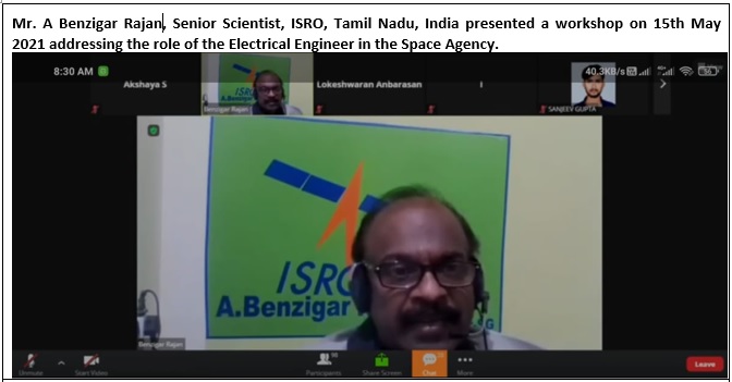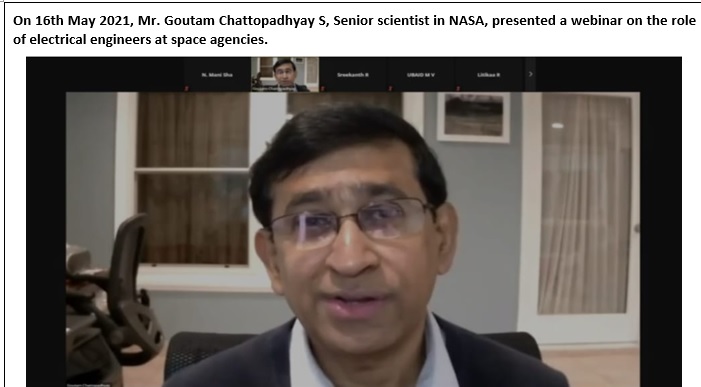 10. Conducted 3- Days Workshop on “Role of Electrical Engineer in Space Agency”, by Mr. Roger Hunter (Program Manager, NASA, California, United States), Mr. A Benzigar Rajan (Scientist, ISRO, Tamilnadu, India) and Mr. Goutam Chattopadhyay (Senior Scientist, NASA-JPL, California, United States) held from 14/05/2021 to 16/05/2021.