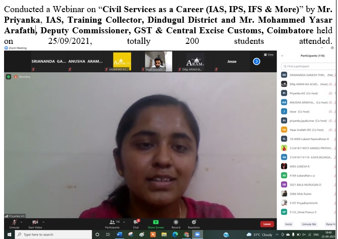14. Conducted a Webinar on “Civil Services as a Career (IAS, IPS, IFS & More)” by Mr. Priyanka, IAS, Training Collector, Dindugul District and Mr. Mohammed Yasar Arafath, Deputy Commissioner, GST & Central Excise Customs, Coimbatore held on 25/09/2021.