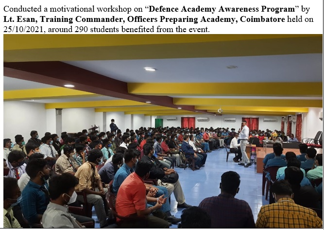 15. Conducted a motivational workshop on “Defence Academy Awareness Program” by Lt. Esan, Training Commander, Officers Preparing Academy, Coimbatore held on 25/10/2021.